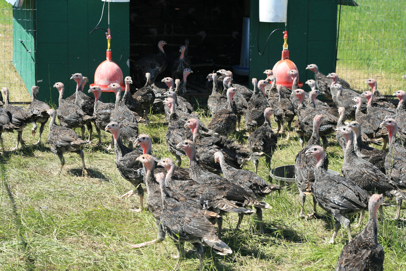 An overview of the turkeys in the pasture in their outdoor pen. This is day 2 for the birds. You can tell where the birds have been by the "wake" they've left behind them. This "wake" is remarkably beneficial for the pasture and the birds - which means more nutritious and delicious for YOU and YOUR FAMILY.